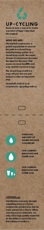With a new look and feel to Looptworks' weekender bag, it demanded a hang tag just as clean and informative. Pulling inspiration from Patagonia's tags, I recreated the hang tags to show a new direction of recycling - Upcycling. Below are images of my process.